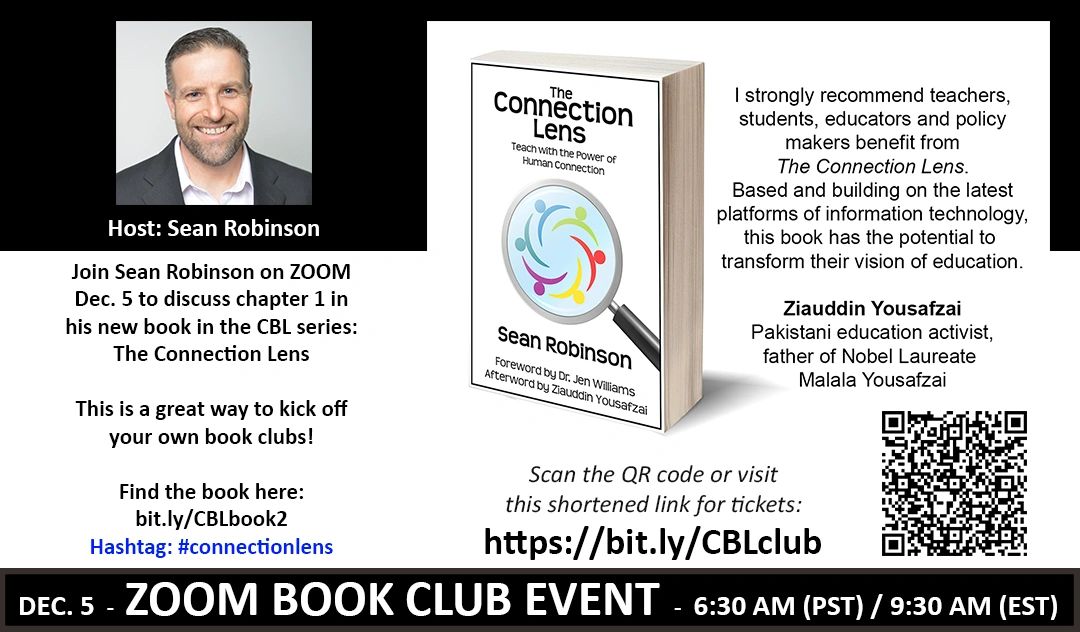 Here is a video of the Connection Lens Book Club Launcher. Once again educators from across the globe gather to discuss Sean Robinson's new book, The Connection Lens. This video is an introduction for educators to connections-based learning and a catalyst for educators to host their own CBL book clubs.