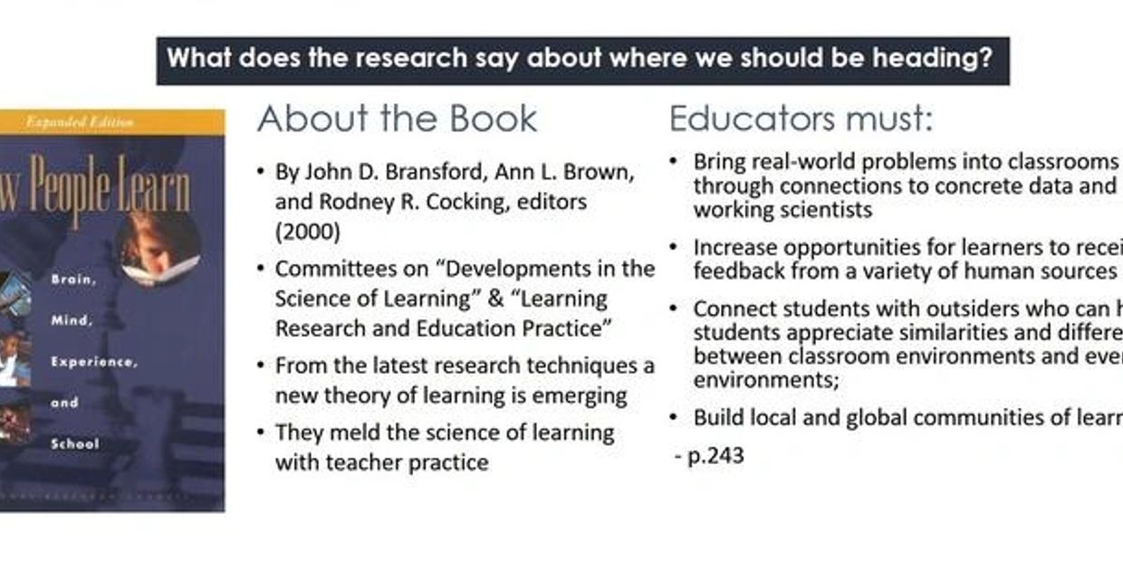 In the book, How People Learn: Brain, Mind, Experience, and School, Bransford et al. posit a new theory of learning from new research techniques. As they look at the science of learning, their recommendations for teacher practice include connections to helpful outsiders, working scientists, and communities of learning.