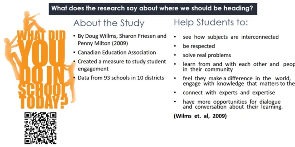 Willms, Friesen, and Milton (2009) developed a measure of student engagement and gathered student engagement data from 93 schools. From their research, they make recommendations that students solve real problems, learn from the community, and connect with experts and expertise.